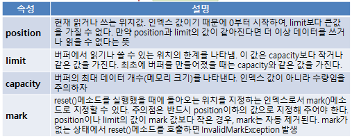 | XXXBuffer | XXXBuffer.allocate(int capacity) | capacity개 만큼의 XXX(타입)값을 저장 |