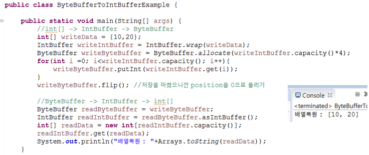 - ByteBuffer -> IntBuffer의 경우 ByteBuffer의 asIntBuffer()메소드를 사용하여 IntBuffer로 변환해준다.