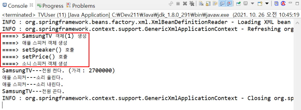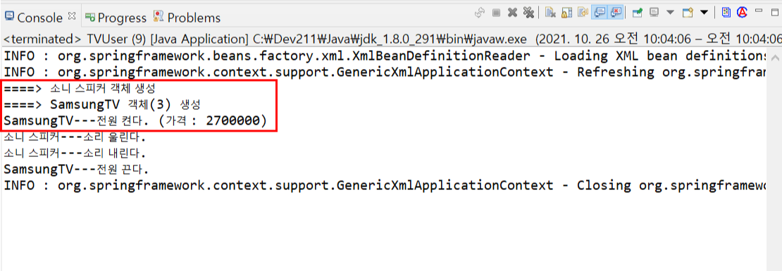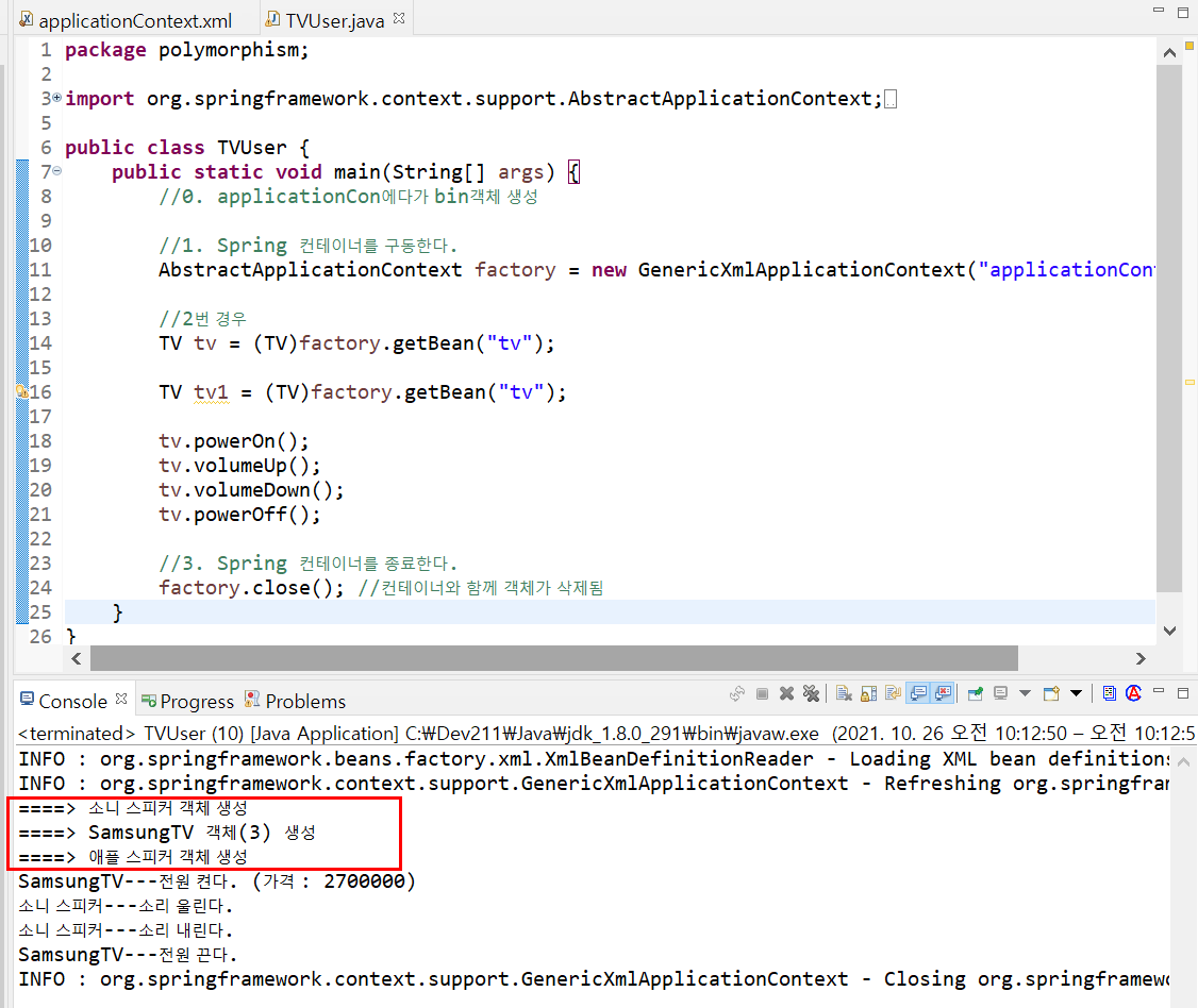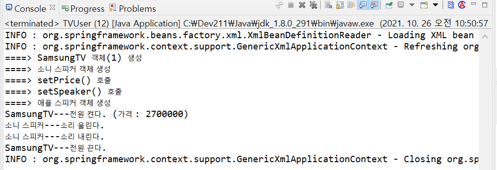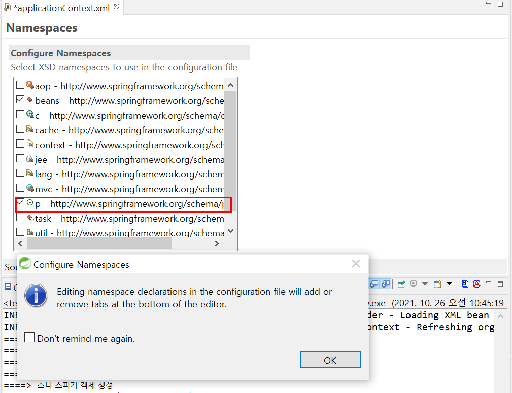 - applicationContext.xml > nemespaces > p 태그 체크 > 저장