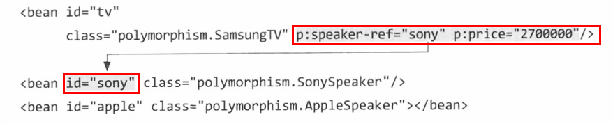 <bean id="tv" class="polymorphism.SamsungTV" p:speaker-ref="sony" p:price="2700000">
